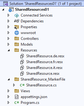 By default, Asp.Net Core 8 MVC technology envisions separate resource file .resx for each controller and the view. But most people do not like it, since most multilanguage strings are the same in different places in the application, we would like it to be all in the same place. Literature [1] calls that approach the “Shared Resources” approach. In order to implement it, we will create a marker class SharedResoureces.cs to group all the resources.