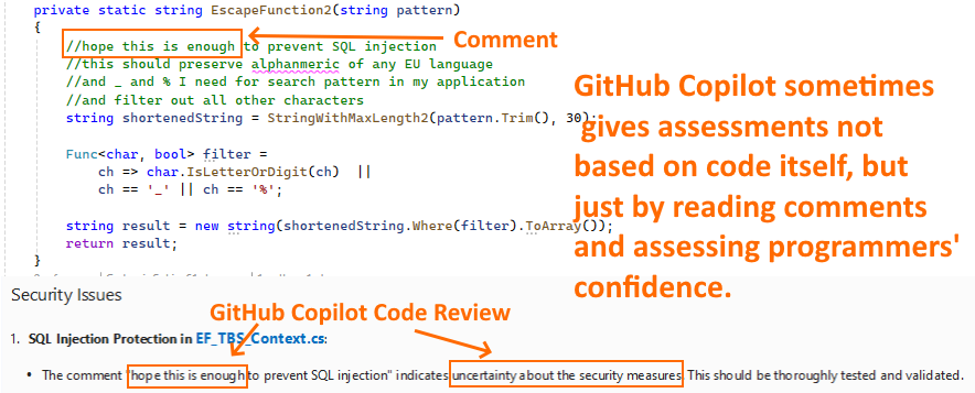 - The first thing is a funny one. AI thing was reading MY OWN COMMENTS IN CODE, not the code itself, and was telling me I sound “insecure” in my comments. I do not need an opinion on my comments, I need an opinion on my code. Based on my comments, it gives an evaluation of my code. If I have put a comment like “this is a great method,” would it think it is great? So, the quote of GHC is here: “The comment 'hope this is enough to prevent SQL injection' indicates uncertainty about the security measures. This should be thoroughly tested and validated.” If my company sees that, they will need to hire a Junior guy, they are ALWAYS SURE they covered all the possibilities, no matter what code they write. Funny, GHC is giving a psychological profile of developers instead of looking into real code to see if it works.