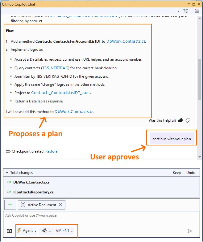 Now, the generated code has correct syntax, compiles right away, and the referred properties/methods do exist. This time, it actually starts to look like a proper work process. GHC Agent automates VS2022, so on a psychological level, it actually looks like someone else has overtaken control of your dev tools.