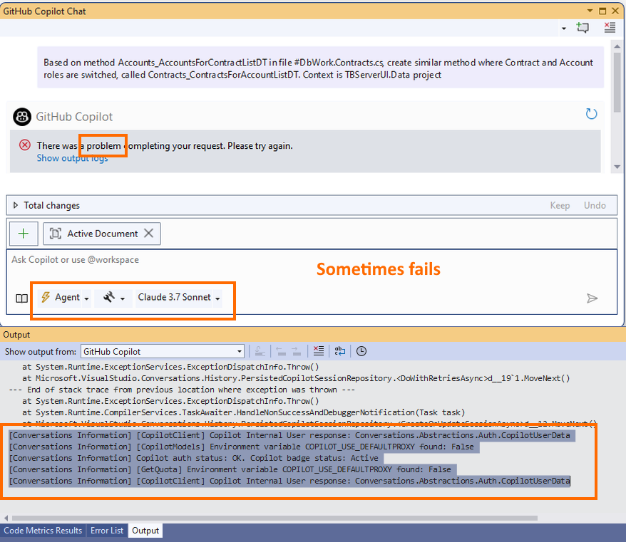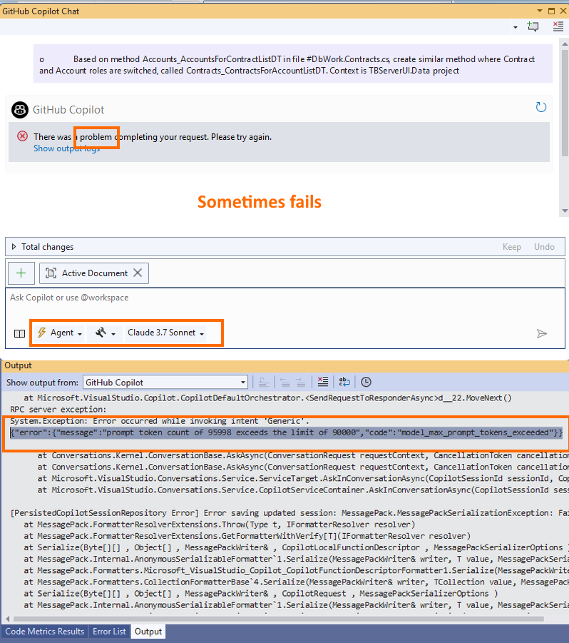 - It started to work on something. Then, in the chat window, it was loading like 6 files from the project. Then it said it is going to load 786 files of the project. Then it breaks, with an error in VS2022: